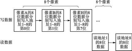 數(shù)據(jù)寫入SRAM存儲器中的組織方式有兩種:位平面法和組合像素法。位平面法是指像素的每一位分別存放在不同的存儲設(shè)備中;組合像素法是指畫面上每個像素的所有位均集中存放在單個存儲設(shè)備中。LED屏像素數(shù)據(jù)每一位的權(quán)值是不同的,高位的權(quán)值高,也就意味著高位為1時LED的點亮?xí)r間要長。根據(jù)兩種存儲結(jié)構(gòu)的特點,對于LED屏,采用位平面結(jié)構(gòu)有利于提高LED屏的顯示效果,從而更容易實現(xiàn)D/T(data to time)轉(zhuǎn)換。位平面法的數(shù)據(jù)需要重新組織,利用位平面結(jié)構(gòu)有利于提高LED屏的顯示效果。數(shù)據(jù)重構(gòu)示意圖如圖2所示。