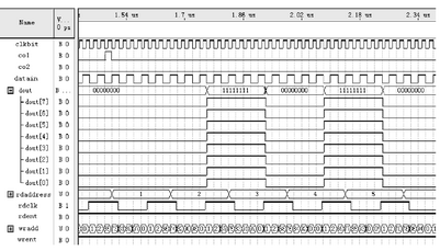 數(shù)據(jù)重構(gòu)后,通過QuartusⅡ軟件編譯,得出如圖3所示仿真波形。其中,當(dāng)col為1時,表示已寫完上面8個地址的數(shù)據(jù),此時讀地址計數(shù)器開始計數(shù)。datain為串行輸入數(shù)據(jù),dout為串行輸出數(shù)據(jù)。