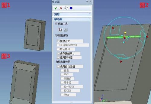 第一、在實(shí)體設(shè)計(jì)右側(cè)的設(shè)計(jì)元素庫(kù)中拖拽入長(zhǎng)方體編輯包圍盒的尺寸為200、120、70。再?gòu)挠覀?cè)的設(shè)計(jì)元素庫(kù)中拖入孔內(nèi)長(zhǎng)方體放到長(zhǎng)方體表面的中心修改尺寸為140、85、4。選中如圖2所示的面,并按鍵盤F10或者鼠標(biāo)左鍵點(diǎn)擊三維球圖標(biāo)的快捷鍵,空格鍵三維球與面脫離關(guān)聯(lián)并用點(diǎn)定位的方式移動(dòng)到靠里邊的邊的中點(diǎn),再拾取三維球的定向操作柄指向大的長(zhǎng)方體的邊的中點(diǎn)。最后四個(gè)面分別用此操作形成如圖1、2、3所示。