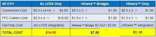 與V-by-One和eDP方案的成本比較時,目前此兩種標(biāo)準(zhǔn)與之接近,但是它們現(xiàn)在的方案只能滿足PC的屏幕的需求,對于更大尺寸的電視,HDwire是其最佳選擇。