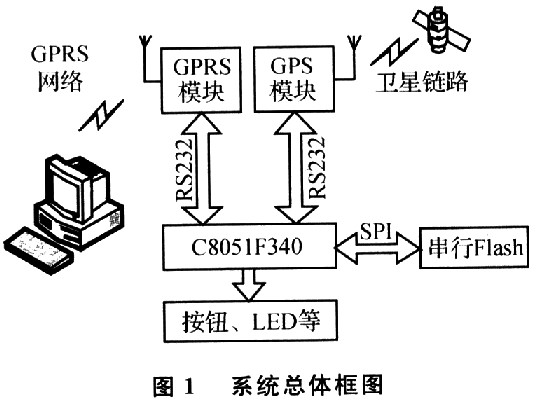 整個(gè)系統(tǒng)以Silicon Labs公司推出的混合信號(hào)片上系統(tǒng)型單片機(jī)C8051F340作為核心控制單元,采用GSM/GPRS/EDGE無(wú)線模塊MC75作為與遠(yuǎn)程服務(wù)器的通信模塊,采用上海麗浪電子有限公司推出的R36模塊作為GPS模塊,通過(guò)GPS衛(wèi)星接收RMC格式的導(dǎo)航電文供終端設(shè)備定位用。C8051F340單片機(jī)包含兩個(gè)TTL電平的串行接口,分別與GPRS模塊和GPS模塊進(jìn)行通信。GPRS模塊可接收遠(yuǎn)程控制臺(tái)發(fā)來(lái)的控制指令,并傳輸給單片機(jī)進(jìn)行處理。系統(tǒng)總體框圖如圖1所示。