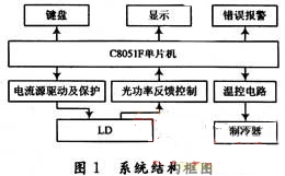 本系統(tǒng)原理如圖1所示,主要實(shí)現(xiàn)電流源驅(qū)動(dòng)及保護(hù)、光功率反饋控制、恒溫控制、錯(cuò)誤報(bào)警及鍵盤顯示等功能,整個(gè)系統(tǒng)由單片機(jī)控制。本系統(tǒng)中選用了C8051F單片機(jī)。C8051F單片機(jī)是完全集成的混合信號系統(tǒng)級芯片(SOC),他在一個(gè)芯片內(nèi)集成了構(gòu)成一個(gè)單片機(jī)數(shù)據(jù)采集或控制系統(tǒng)所需要的幾乎所有模擬和數(shù)字外設(shè)及其他功能部件,如本系統(tǒng)中用到的ADC和DAC。這些外設(shè)部件的高度集成為設(shè)計(jì)小體積、低功耗、高可靠性、高性能的單片機(jī)應(yīng)用系統(tǒng)提供了方便,也大大降低了系統(tǒng)的成本。光功率及溫度采樣模擬信號經(jīng)放大后由單片機(jī)內(nèi)部A/D轉(zhuǎn)換為數(shù)字信號,進(jìn)行運(yùn)算處理,反饋控制信號經(jīng)內(nèi)部D/A轉(zhuǎn)換后再分別送往激光器電流源電路和溫控電路,形成光功率和溫度的閉環(huán)控制。光功率設(shè)定從鍵盤輸入,并由LED數(shù)碼管顯示激光功率和電流等數(shù)據(jù)。