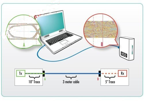 為滿足兼容性要求,USB3.0線材信號必須可以通過3米長的線纜,并保持信號眼圖開口有足夠的寬度。但這只是部分的路徑,因為在兼容性測試中測量的是接收器經(jīng)過均衡化處理過后的信號。舉例來說,在一般的筆記本電腦架構(gòu)中,USB控制芯片到連接器的距離大約是10英寸,因此信號實際上可能另外經(jīng)過大約半米的路徑和數(shù)個連接器。