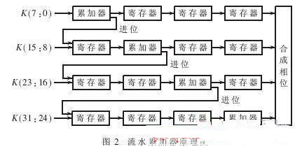 在用FPGA設(shè)計DDS電路時,相位累加器是決定DDS電路性能的一個關(guān)鍵部分。為使輸出波形具有較高的分辨率,本系統(tǒng)采用32位累加器。但若直接用32位加法器構(gòu)成累加器,則加法器的延時會大大限制累加器的操作速度。因此,這里引入了流水線算法,即采用4個8位累加器級聯(lián)結(jié)構(gòu),每級用一個8位累加器實現(xiàn)該部分相位相加,然后將進位值傳給下一級做進一步累加。這樣可大幅提高系統(tǒng)的工作速度。但由于累加器是一個閉環(huán)反饋電路,因此必須使用寄存器,以保證系統(tǒng)的同步、準確運行。具體實現(xiàn)如圖2所示。