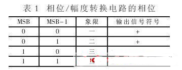 相位/幅度轉(zhuǎn)換電路是DDS電路中的另一個關(guān)鍵部分,設(shè)計中面臨的主要問題就是資源的開銷。該電路通常采用ROM結(jié)構(gòu),相位累加器的輸出是一種數(shù)字式鋸齒波,通過取它的若干位作為ROM的地址輸入,而后通過查表和運算,ROM就能輸出所需波形的量化數(shù)據(jù)。考慮到正弦函數(shù)的對稱性:在[0,2π]內(nèi),正弦函數(shù)關(guān)于x=π成奇對稱,在[0,π]內(nèi),關(guān)于x=π/2成軸對稱。因此,在正弦查找表中只須存儲相位在[0,π/2]的函數(shù)值。這樣,通過一個正弦碼表的前1/4周期就可以變換得到整個周期碼表,節(jié)省了近3/4的資源,非常可觀。具體實現(xiàn)如表1所示,為節(jié)省ROM資源,取相位累加器輸出的高8位做為ROM的輸入地址,其中最高位(MSB)控制對輸出信號符號的處理,次高位(MSB-1)控制對輸入地址的處理。