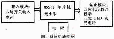 圖1為系統(tǒng)組成框圖。系統(tǒng)主要由89S51單片機(jī)系統(tǒng)及ISP下載電路、輸入模塊、輸出模塊、電源電路等四大部分組成。