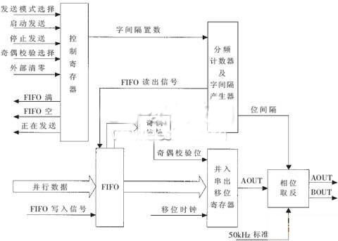 發(fā)送部分的主要功能是將DSP送入的數(shù)據(jù)暫存在FPGA內(nèi)部的FIFO中,等待發(fā)送命令。一旦接到發(fā)送控制指令,F(xiàn)IFO輸出數(shù)據(jù)并通過并/串轉換將并行數(shù)據(jù)轉換為串行數(shù)據(jù),同時加入預先設定的間隔。用戶可通過寫控制寄存器選擇發(fā)送模式(即單幀發(fā)送或自動重復發(fā)送)、發(fā)送通道延遲設定、發(fā)送通道字間隔設定,還可通過讀取狀態(tài)位檢查它的工作狀態(tài)(發(fā)送緩沖器空、發(fā)送緩沖器滿和是否正在發(fā)送)。發(fā)送模塊結構框圖如圖4所示。