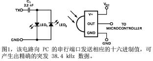 圖1中的電路與串行端口輸出阻抗和電容一起構成了一個高通濾波器。正脈沖驅動一只紅外LED;負脈沖驅動另一只。兩只都應指向接收器。PC端口一般提供5mA~20mA的最大電流,以及±15V電壓,因此輸出電阻在數千歐姆范圍內。一般不需要限流電阻。多數情況下,電容容量為1nF~10nF就可以了。接收器有寬容度。如果是非PC端口,則需要調整電容值,例如微控制器,因為它的阻抗較低。在實際應用中,如果LED對準接收器,用低至5mA的LED峰值電流就可以實現2米~4米的傳輸距離??商峁C的實例程序。
