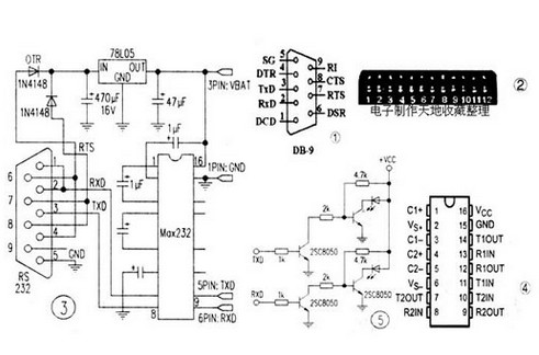 元件選擇: 本電路的核心為MAX232集成塊,常見(jiàn)的有兩種封裝,一種為雙列直插式,體積稍大,焊接方便;另一種為貼片式,體積較小。此外,如找不到MAX232,也可用MAX232A、 HIN232、MAX220、MAX3232、IL32等RS232收發(fā)器集成塊代替,管腳定義和MAX232相同,前兩種集成塊速度較快。78L05外表和普通三極管一樣,購(gòu)買(mǎi)時(shí)要注意問(wèn)清管腳定義。如發(fā)現(xiàn)發(fā)熱嚴(yán)重可用7805代替,或者用1V穩(wěn)壓管加接限流電阻代替。電容的焊接要注意分清正負(fù)極。濾波電容兩端并上一只0.1uF的CBB電容效果更好。4個(gè)參數(shù)電容最好選用鉭電容等優(yōu)質(zhì)電容,根據(jù)集成塊不同可選擇luF或O.1uF的容量。比較難找的是手機(jī)插頭,不過(guò)可以從同類(lèi)型接口的廢舊充電器上取得,但要注意所有金屬針腳都要齊全的。電纜用帶屏蔽的6芯電纜。 以上材料可以在電子元器件商店或電腦網(wǎng)絡(luò)耗材店購(gòu)得,10元左右就能買(mǎi)齊。