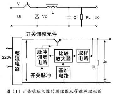 圖(1)畫出了開關(guān)穩(wěn)壓電源的原理圖及等效原理框圖,它是由全波整流器,開關(guān)管Vi,激勵信號,續(xù)流二極管VD,儲能電感和濾波電容C組成。實(shí)際上,開關(guān)穩(wěn)壓電源的核心部分是一個直流變壓器。這里我們對直流變換器和逆變器作如下解釋。逆變器,它是把直流轉(zhuǎn)變?yōu)榻涣鞯难b置。逆變器通常被廣泛地應(yīng)用在采用電平或電池組成的備用電源中。直流變換器,它是把直流轉(zhuǎn)換成交流,然后又把交流轉(zhuǎn)換成直流的裝置。這種裝置被廣泛地應(yīng)用在開關(guān)穩(wěn)壓電源中。采用直流變換器可以把一種直流供電電壓變換成極性、數(shù)值各不同的多種直流供電電壓。