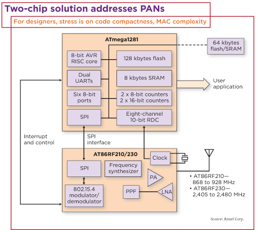 Atmel已經(jīng)推出了一種雙芯片解決方案,該方案將ATmega1281(或ATmega2561)AVR微控制器與AT86RF230 RF器件整合在一起,能提供兩種PAN應(yīng)用頻段。目前的RF230為2.4GHz頻段,隨后推出的RF210將工作在868到928MHz頻段。該公司的MAC軟件是為AVR系列MCU內(nèi)的8位RISC內(nèi)核優(yōu)化設(shè)計(jì)的。Z-Link RF器件號(hào)稱可以提供最好的鏈接“預(yù)算”,在不帶外接功放的ZigBee方案中能達(dá)到103dB。