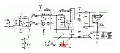 該電路由用作模擬前端電路的AD8295和AD8275、ADC AD7687以及基準(zhǔn)電壓源ADR431組成,只需少量外部元件進(jìn)行去耦等。