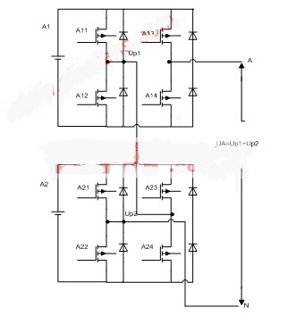 所謂移相式PWM技術(shù)就是將調(diào)制波和載波的頻率固定不變,調(diào)制波的相位也保持恒定,而只調(diào)整載波的相位,從而產(chǎn)生SPWM信號(hào)。將不同載波相位下的SPWM信號(hào)進(jìn)行線性組合,達(dá)到消除諧波、提高輸出功率的目的??梢宰C明,當(dāng)相移 時(shí)(α為同相的各單元的載波的移相角度,N 為級(jí)聯(lián)單元個(gè)數(shù))[2],輸出諧波頻率增大到 2N 倍,更易于濾除。對(duì)于三相五電平變頻器,N=2,所以同相級(jí)聯(lián)兩單元的載波相差90度。如圖2所示,其中A11與
