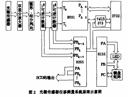 圖 2是利用光柵傳感器構(gòu)成的位移量自動(dòng)測(cè)量系統(tǒng)原理示意圖。該系統(tǒng)采用光柵移動(dòng)產(chǎn)生的莫爾條紋與電子電路以及單片機(jī)相結(jié)合來完成對(duì)位移量的自動(dòng)測(cè)量,它具有判別光柵移動(dòng)方向、預(yù)置初值、實(shí)現(xiàn)自動(dòng)定位控制及過限報(bào)警、自檢和掉電保護(hù)以及溫度誤差修正等功能。下面對(duì)該系統(tǒng)的工作原理及設(shè)計(jì)思想作以介紹。