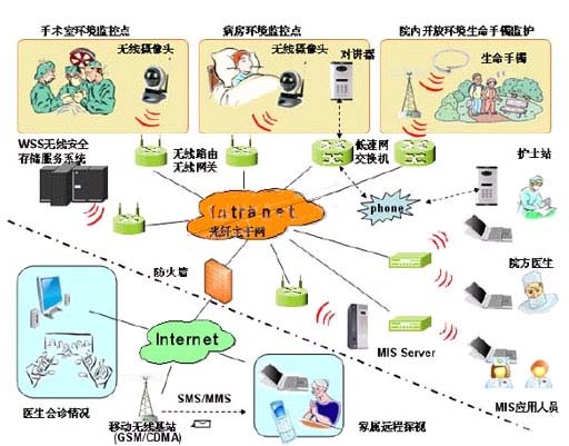 通過構(gòu)架寬帶無線局域網(wǎng)(WIFi),以802.11作為無線連接協(xié)議,支持互連協(xié)議DLNA、IGRS,甚至UPnP,支持采用支持無線寬帶路由的視頻監(jiān)控設(shè)備,在病房指定監(jiān)護(hù)點(diǎn)內(nèi)設(shè)置無線攝像頭,通過無線路由器將圖象傳輸?shù)阶o(hù)士站的監(jiān)控屏,從而方便醫(yī)生、護(hù)士在與病人對講時(shí),還能觀察到病房內(nèi)病人的實(shí)際情況,進(jìn)行實(shí)時(shí)監(jiān)控;同時(shí),配置的無線安全存儲(chǔ)系統(tǒng)(WSS)可以自動(dòng)接收通過無線傳輸?shù)膱D象,以便值班醫(yī)生和主治醫(yī)生可以非現(xiàn)場了解病人的病情和狀態(tài),甚至可以通過互聯(lián)網(wǎng)取得需要的實(shí)時(shí)圖象,檢索和查詢歷史圖象。系統(tǒng)還可以根據(jù)醫(yī)生要求,通過無線方式,對病人增加多個(gè)監(jiān)控點(diǎn),進(jìn)行靈活按需監(jiān)控。圖中的設(shè)備均留有與局域網(wǎng)的接口,可以通過有線的方式接入網(wǎng)絡(luò),形成多種解決方案,并可與醫(yī)院現(xiàn)行的醫(yī)院信息管理系統(tǒng)、移動(dòng)通信、互聯(lián)網(wǎng)有機(jī)融合。