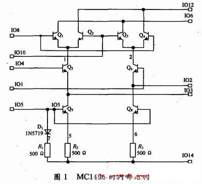 MC1496的內(nèi)部結(jié)構(gòu)如圖1所示,圖2為利用乘法器實現(xiàn)的普通調(diào)幅的仿真電路(調(diào)制信號為200 mV/20 kHz,載波信號為100 mV/1 MHz)及波形圖,仿真波形圖中橫軸為時間(20 μs/div),縱軸為幅度(20 mV/div)。圖3為利用乘法器實現(xiàn)的雙邊帶調(diào)幅的仿真電路(調(diào)制信號為200 mV/20 kHz,載波信號為100 mV/1 MHz)及波形圖,仿真波形圖中橫軸為時間(20μs/div),縱軸為幅度(500μv/div)。