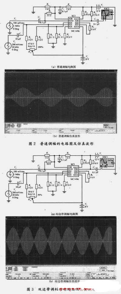 在授課過程中,對于電路進行理論分析的同時,可通過Multisim,EWB,PSPICE,SystemView等仿真軟件輔以生動的仿真演示,實現(xiàn)理論講解和驗證的同步進行,不僅能增強教學(xué)的直觀性與靈活性,而且能夠最大限度地利用有限的授課學(xué)時,加深學(xué)生對基本理論知識的理解,為傳統(tǒng)的教學(xué)方法注入活力。例如,可采用非線性器件所構(gòu)造的模擬乘法器MC1496來實現(xiàn)信號調(diào)幅、檢波、混頻、鑒相等電路,其原理在很多文獻書籍當中均有描述,通過仿真演示可使學(xué)生更加直觀的了解。