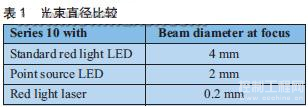 連接在點光源LED側(cè)面的焊線以及精密的光學元件,還可以從紅光傳感器中產(chǎn)生幾乎等同于激光的光束(焦點處的光束直徑:2毫米)。因此,這些紅光傳感器在精度上比采用從側(cè)面接近的常規(guī)LED傳感器有顯著的提高。如果需要可靠地檢測比較大型的物體,則標準的紅光LED仍然是首選。