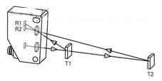 帶背景抑制的漫反射式傳感器不僅可以分析入射光的強度,同時也能分析物體反射光的入射角。反過來,該入射角僅由物體與傳感器之間的距離(T1或T2)決定,然后由位置敏感的接收器元件將對該位置(R1,R2)進行估算。