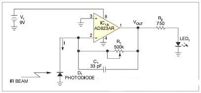 放大器IC1A配置為一個(gè)光伏放大器。當(dāng)IR光能作用到光電二極管D1上時(shí),D1生成一個(gè)小的光電流,它嘗試將反相輸入端拉至負(fù)值。同時(shí),IC1A的輸出變?yōu)檎担瑢⒎糯笃鱌in2的虛擬地結(jié)點(diǎn)保持在0V.電路的傳輸函數(shù)為VOUT=I×R1.如果設(shè)定增益為高,則當(dāng)電路檢測(cè)到光時(shí),IC1A變至電源軌。Analog Devices公司的AD823AR JFET輸入放大器通過一個(gè)750Ω的限流電阻直接驅(qū)動(dòng)LED.C1為放大器做補(bǔ)償,防止其由于D1的電容負(fù)載以及輸入寄生電容而產(chǎn)生振蕩。