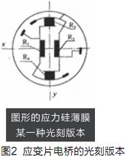 硅壓阻式壓力傳感器是采用高精密半導(dǎo)體電阻應(yīng)變片組成惠斯頓電橋作為力電變換測量電路的,具有較高的測量精度、較低的功耗,極低的成本?;菟诡D電橋的壓阻式傳感器,如無壓力變化,其輸出為零,幾乎不耗電。其電原理如圖1所示。硅壓阻式壓力傳感器其應(yīng)變片電橋的光刻版本如圖2。
