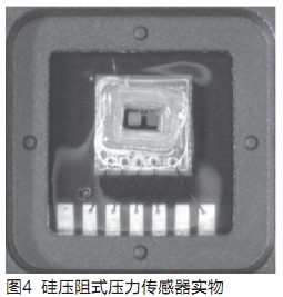 MEMS硅壓阻式壓力傳感器采用周邊固定的圓形的應(yīng)力杯硅薄膜內(nèi)壁,采用MEMS技術(shù)直接將四個高精密半導(dǎo)體應(yīng)變片刻制在其表面應(yīng)力最大處,組成惠斯頓測量電橋,作為力電變換測量電路,將壓力這個物理量直接變換成電量,其測量精度能達(dá)0.01%~0.03%FS。硅壓阻式壓力傳感器結(jié)構(gòu)如圖3所示,上下二層是玻璃體,中間是硅片,硅片中部做成一應(yīng)力杯,其應(yīng)力硅薄膜上部有一真空腔,使之成為一個典型的絕壓壓力傳感器。應(yīng)力硅薄膜與真空腔接觸這一面經(jīng)光刻生成如圖2的電阻應(yīng)變片電橋電路。當(dāng)外面的壓力經(jīng)引壓腔進(jìn)入傳感器應(yīng)力杯中,應(yīng)力硅薄膜會因受外力作用而微微向上鼓起,發(fā)生彈性變形,四個電阻應(yīng)變片因此而發(fā)生電阻變化,破壞原先的惠斯頓電橋電路平衡,產(chǎn)生電橋輸出與壓力成正比的電壓信號。圖4是封裝如IC的硅壓阻式壓力傳感器實物照片。