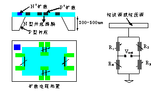 利用壓阻效應(yīng)原理,采用集成工藝技術(shù)經(jīng)過摻雜、擴散,沿單晶硅片上的特定晶向,制成應(yīng)變電阻,構(gòu)成惠斯通電橋,利用硅材料的彈性力學(xué)特性,在同一硅材料上進行各向異性微加工,就制成了一個集力敏與力電轉(zhuǎn)換檢測于一體的擴散硅傳感器,如圖1所示。
