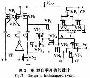 當(dāng)uI=UIsin(2πfIt)時(shí),圖1中的CMOS開關(guān)N1和N2的導(dǎo)通電阻與輸入信號(hào)呈非線性關(guān)系,因此對(duì)連續(xù)時(shí)間信號(hào)采樣時(shí),會(huì)產(chǎn)生信號(hào)失真和幅度波動(dòng),這限制了采樣速率和S/H電路的開啟時(shí)間;且CMOS開關(guān)的柵.源電壓越大,導(dǎo)通電阻越小。若將N1和N2設(shè)計(jì)為柵-源自舉開關(guān),就能保證N1和N2的柵-源電壓不超出VDD,則導(dǎo)通電阻接近于常數(shù)并使失真降到最低。于是設(shè)計(jì)的柵.源自舉開關(guān)如圖2所示,CP為高電平時(shí),VN1和VN2導(dǎo)通,電容C3充電至VDD,VN8和VN6導(dǎo)通,VN7關(guān)閉。CP為低電平時(shí),VN1,VN2和VN8斷開,VP4,VH5和VN7導(dǎo)通,C3上電壓就經(jīng)過VP4,VN7和VN5加至VP5上,其柵-源電壓UGS=VDD;當(dāng)CP為高電平時(shí),柵-源自舉開關(guān)Nl和N2導(dǎo)通,CP為低電平時(shí)柵.源自舉開關(guān)N1和N2關(guān)斷。在CP相VN6導(dǎo)通,A點(diǎn)電壓較高,開關(guān)VN1和VN2呈現(xiàn)阻性負(fù)載,因此存在著如圖2中虛線所示的泄漏電流ID,嚴(yán)重制約運(yùn)放增益的提高。采用VP6進(jìn)行鉗位,使得CP相VN6處于關(guān)閉狀態(tài),并使采樣開關(guān)N1和N2自舉電壓提高10%,泄漏電流減小40%。由于存在著襯偏效應(yīng),所以N1和N2的導(dǎo)通電阻不能保持為定值,采用小尺寸的VP5不但可減小導(dǎo)通電阻,而且能改善線性度。圖2中輸出緩沖電容C4起到隔離作用。