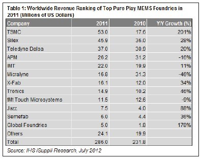 在12家提供MEMS制造業(yè)務(wù)的純代工廠商中,臺(tái)積電名列前茅。除了臺(tái)積電以外,去年MEMS營(yíng)業(yè)收入增長(zhǎng)的其它代工廠商包括Silex Microsystems、Teledyne Dalsa、Innovative Micro Technology、X-Fab, Tronics、Jazz Semiconductor、Semefab和GlobalFoundries。營(yíng)業(yè)收入下滑的廠商是Asia-Paci?c Microsystems、Micralyne和tMt Touch Microsystems,如表1所示。