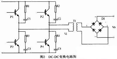 DC-DC變換電路如圖2所示。圖中每個(gè)IGBT旁均并聯(lián)有阻容吸收回路(RC)作為緩沖器,在IGBT瞬間斷開(kāi)時(shí),緩沖器元件RC將通過(guò)提供交流通道減少功率管斷開(kāi)時(shí)的集電極電壓應(yīng)力。