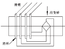 將專(zhuān)用的測(cè)扭應(yīng)變片用應(yīng)變膠粘貼在被測(cè)彈性軸上,并組成應(yīng)變橋,若向應(yīng)變橋提供工作電源即可測(cè)試該彈性 軸受扭的電信號(hào)。這就是基本的扭矩傳感器模式。(見(jiàn)圖二)但是在旋轉(zhuǎn)動(dòng)力傳遞系統(tǒng)中,最棘手的問(wèn)題是旋轉(zhuǎn)體上的應(yīng)變橋的橋壓輸入及檢測(cè)到的應(yīng)變信號(hào)輸出如 何可靠地在旋轉(zhuǎn)部分與靜止部分之間傳遞,通常的做法是用導(dǎo)電滑環(huán)來(lái)完成。