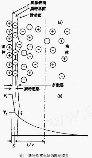 任何固體與任何液體相互接觸時,都會使固體表面呈現(xiàn)出帶電現(xiàn)象。究其原因主要有以下幾個方面: (1) 固體表面對離子的吸附;(2) 離子晶體的溶解;(3) 固體表面的電離;(4) 固體具有n 型(空穴型)或p 型(電子過剩型) 缺陷;(5) 兩相對電子的親合力不同。不管是由哪種原因引起的,當固體表面帶電以后,它必然要吸引等量的反極性電荷在其周圍。這樣在緊靠帶電固體表面處就形成一層特殊的表面層———雙電層。雙電層的經(jīng)典理論有以下三種:德拜—尤格爾理論;古依—查普曼理論;斯特恩理論。其中斯特恩理論對實驗結(jié)果的解釋至今絕大部分仍然是正確的。斯特恩雙電層的理論模型如圖1 所示。從圖中可以看出,雙電層由一個稱為斯特恩平面的平面(實際上是一個假想平面) 將它分成二部分:內(nèi)層為斯特恩層,外層為擴散層,在擴散層中,反電荷離子富集。