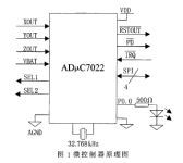 ADuC7022的串行接口提供了SPI、UART、I2C接口。ADuC7022的I/O口為復(fù)用接口,用戶通過設(shè)置SPM模塊的控制寄存器可在GPIO、UART、UART/SPI/I2C和可編程邏輯陣列中做出選擇。本文硬件使用了一個工作于Master模式的SPI模塊,連接到無線 USB模塊。微控制器的原理圖如圖1所示。