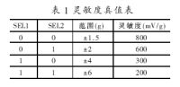 SEL1和SEL2為靈敏度選擇輸入引腳,對應(yīng)靈敏度的真值表如表1所示。加速度傳感器輸出電壓VOUT為: