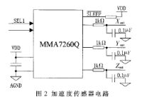 加速度傳感器電路如圖2所示。在MMA7260Q的輸出上設(shè)置了RC濾波器,用于濾除內(nèi)部開關(guān)濾波電容時鐘的干擾,提高測量的精度。