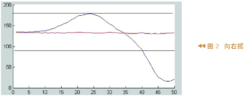 從圖1和圖2中可以看出,兩條黑線之間的數(shù)據(jù)很難斷定是哪個動作產生的,因為兩個動作都可能產生這樣的值。所以,利用黑線之外的數(shù)據(jù)來判定是向右還是向左搖。因為對于這兩個動作,黑線之外的數(shù)據(jù)有明顯的差異,數(shù)據(jù)相差很多。對于圖1這些數(shù)據(jù)大于150,圖2中這些數(shù)據(jù)小于90。因此這些數(shù)據(jù)至少相差60,可以很容易地將向左、向右的兩個動作區(qū)分開。
