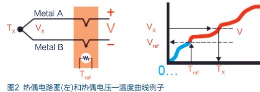 熱電偶是溫度測(cè)量中最常用的傳感器。其主要好處是寬溫度范圍和適應(yīng)各種大氣環(huán)境,而且結(jié)實(shí)、價(jià)低,無(wú)需供電,尤其最便宜。熱電偶由在一端連接的兩條不同金屬線(金屬A和金屬B)構(gòu)成,如圖1所示。當(dāng)熱電偶一端受熱時(shí),熱電偶電路中就有電勢(shì)差。可用測(cè)量的電勢(shì)差來(lái)計(jì)算溫度。