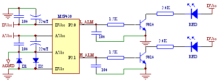 本系統(tǒng)的基本方案是這樣的:ADC12模塊的通道10對芯片的溫度進(jìn)行測量,當(dāng)測量溫度高于或者低于預(yù)設(shè)告警值時,便通過I/O端口的輸出來驅(qū)動LED,顯示告警狀態(tài)。芯片在整個過程中處于低功耗模式。本系統(tǒng)的原理比較簡單,圖1給出其簡單的原理圖。