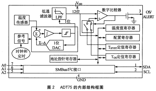 ADT75采用8引腳的MOSP和SOIC封裝,其內(nèi)部結(jié)構(gòu)如圖2所示。