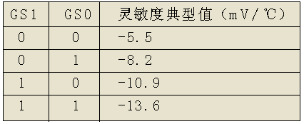 LM94022根據(jù)GS0、GS1被施加的不同電平有4種靈敏度供用戶選擇,如表2所示。用戶可根據(jù)測溫的范圍及接口電路的工作電壓的條件來合理選擇。靈敏度由GS0及GS1的電平確定:高電平要求大于(VDD-0.5V);低電平要求小于0.5V。