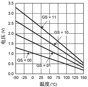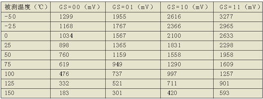 從圖2可看出,其線性度極好,這是線性化后的特性。按表3的數(shù)據(jù)計算出的靈敏度值與表2給出的典型靈敏度有一些差值。例如,在GS=00時,-25℃時的輸出電壓為1168mV,-50℃時的輸出電壓為1299mV,則其平均靈敏度為-5.24mV/℃;50℃時的輸出電壓為760mV,75℃時的輸出電壓為619mV,則其平均靈敏度為5.64mV/℃。表2中GS=00時,靈敏度為-5.5mV/℃。