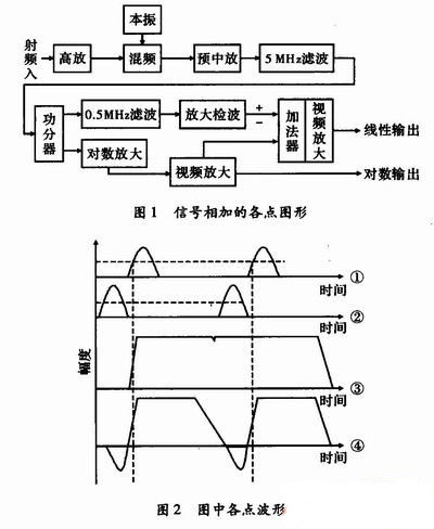 圖2中各點(diǎn)波形:(1)弱信號(hào)時(shí)線性通道輸出視頻波形;(2)弱信號(hào)時(shí)對數(shù)通道輸出視頻波形;(3)強(qiáng)信號(hào)時(shí)無加法器時(shí)線性通道輸出視頻波形;(4)強(qiáng)信號(hào)時(shí)有加法器時(shí)線性通道輸出視頻波形。