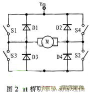 直流電機(jī)驅(qū)動使用最廣泛的就是H型全橋式電路,這種驅(qū)動電路方便地實(shí)現(xiàn)直流電機(jī)的四象限運(yùn)行,分別對應(yīng)正轉(zhuǎn)、正轉(zhuǎn)制動、反轉(zhuǎn)、反轉(zhuǎn)制動。H橋功率驅(qū)動原理圖如圖2所示。