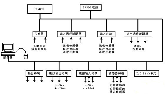 DeviceNet是一種低成本的通訊總線鏈接,具有開放現(xiàn)場網(wǎng)絡(luò)標準,規(guī)范和協(xié)議都是開放的。DeviceNet將控制和數(shù)據(jù)融合在一起,信息具有數(shù)據(jù)標識區(qū),網(wǎng)絡(luò)利用標識區(qū)進行優(yōu)先級仲裁,可以高效傳送I/O數(shù)據(jù)。DeviceNet有兩種不同類型的消息:I/O消息和顯式消息(Explicit Message)。顯式消息用于兩個設(shè)備間點對點消息傳遞,是典型的請求/響應(yīng)方式,常用于設(shè)備主參數(shù)、節(jié)點的配置、故障診斷數(shù)據(jù)等。顯式消息可以在不同公司的設(shè)備間進行通信,I/O消息適用于實時性要求較高和面向控制的數(shù)據(jù)。遠程I/O通信功能使得在從單元和安裝主單元的CPU之間能自動地傳送I/O數(shù)據(jù),對于需要位數(shù)據(jù)又需要信息數(shù)據(jù)交換的應(yīng)用,非常適合采用DeviceNet網(wǎng)絡(luò)。其典型的應(yīng)用如圖1所示: