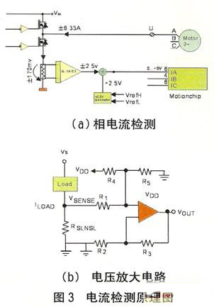 電機(jī)電流檢測(cè)電路可提供重要的反饋信息,將該信息與來(lái)自主控DSP的控制信號(hào)相結(jié)合,可以控制MOSFET或IGBT的柵極驅(qū)動(dòng)芯片并最終調(diào)整電機(jī)速度。如果要實(shí)現(xiàn)過(guò)流保護(hù),還必需進(jìn)行電流監(jiān)控,不過(guò)對(duì)于低端應(yīng)用而言,傳統(tǒng)的過(guò)流保護(hù)卻顯得過(guò)于昂貴。電流采樣的方案是在逆變橋的下橋臂串一 0.027Ω采樣電阻如圖3(a),采樣電流范圍為0~6.22A,采樣后的電壓放大倍數(shù)為14.63倍,放大電路如圖3(b),并經(jīng)2.5V電壓抬升輸入DSP,所以輸入DSP的電流模擬電壓量為: