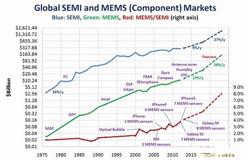飛兆半導(dǎo)體MEMS及傳感器解決方案部副總裁Janusz Bryzek預(yù)計(jì),未來(lái)傳感器數(shù)量或可達(dá)萬(wàn)億顆,這將會(huì)消耗1.3億個(gè)8寸ASIC晶圓以及2.6億個(gè)8英寸MEMS晶圓。Bryzek回顧了1950年以來(lái)的MEMS歷史,并且判斷未來(lái)其增速要高于半導(dǎo)體行業(yè)平均。