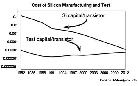圖1. 來自SIA的數(shù)據(jù)表明:隨著時間推移,硅(或者器件功能)的成本在降低,但測試成本卻在持續(xù)增加。