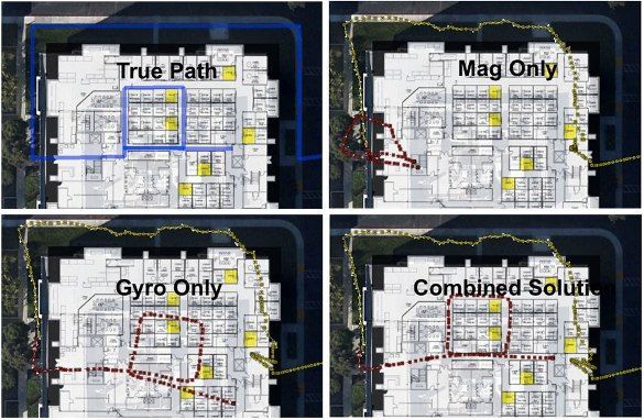 博通的HULA,使用Kalman過濾器來補償單個傳感器的誤差,從而獲得更加精確的位置信息(下右),這些信息可以用一個磁力計(上右)或一個陀螺儀(下左)來獲得。(來源:博通)