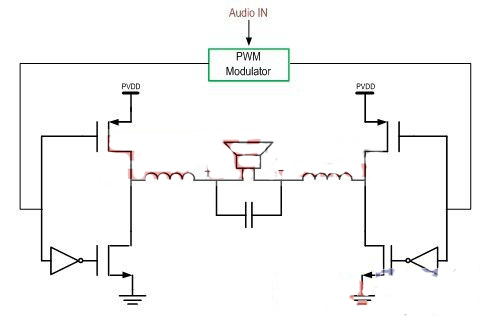 1 固定開關(guān)損耗使靜態(tài)電流更高,使小功率輸出的功效更低。D類放大器本質(zhì)上是開關(guān)電路。在其 基本架構(gòu)下,它們基于對(duì)音頻信號(hào)編碼的模式在ON和OFF之間切換。將開關(guān)輸出通過低通濾波器傳輸至負(fù)載(揚(yáng)聲器),從而恢復(fù)被放大的音頻信號(hào)。參見上面的圖3。