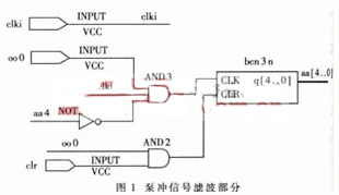 由于要對傳感器信號進行數(shù)字濾波,CPLD要引入時鐘信號。因而我們對CPLD定義一輸入端clki,作為數(shù)字濾波器的計數(shù)脈沖輸入端。clki由單片機定時器1定時產(chǎn)生500Hz脈沖。以一路為例,泵沖信號濾波部分如圖1所示。